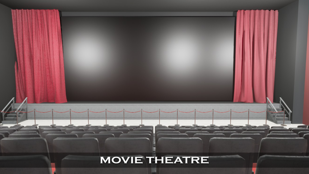 The Virtual Movie Theatre 3D Environment transforms Zoom meetings into cinematic presentation experiences. Clients appear inside a modern theater featuring a large digital screen, ambient lighting, tiered seating visuals, and customizable branding throughout the space. Videos, trailers, presentations, and visual content are seamlessly displayed on the virtual big screen, creating a true cinema-style showcase. Live producers manage camera angles, transitions, and media playback to ensure a smooth, broadcast-quality experience without technical complexity. Ideal for screenings, product launches, premieres, and presentations, this environment delivers a dramatic, immersive atmosphere that captures attention and elevates audience engagement.