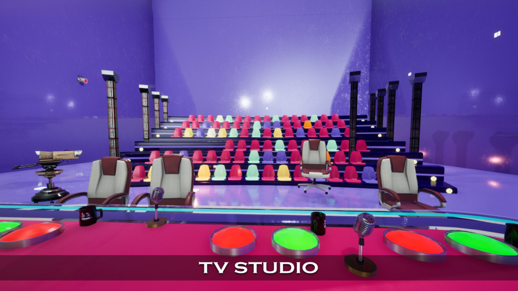 The Virtual TV Studio 3D Environment transforms Zoom meetings into professional broadcast experiences. Clients appear inside a fully designed digital studio featuring cinematic lighting, modern set designs, and customizable branded screens. Presentations, videos, and graphics are seamlessly integrated onto virtual displays, creating a polished, television-style production. Live producers manage camera angles, transitions, and media cues in real time, ensuring a smooth and engaging experience without technical complexity for the client. Ideal for webinars, corporate presentations, product launches, and live events, this environment delivers a high-impact, visually dynamic meeting that elevates communication, strengthens brand presence, and captivates audiences.